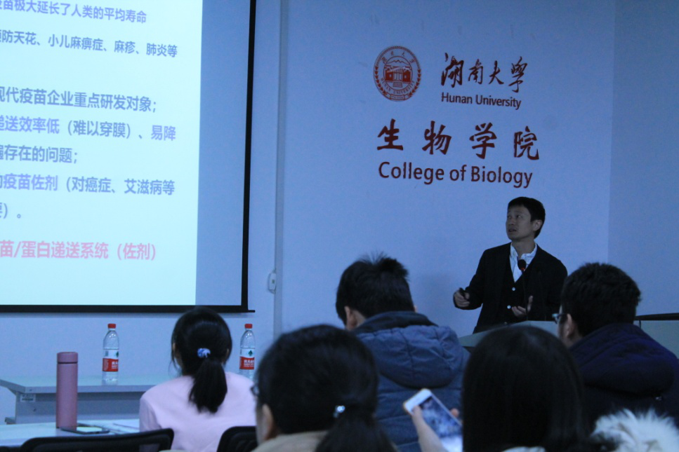 在报告上,杨志谋教授首先介绍了短肽水凝胶的特点和及其应用,随后介绍了通过温和可控的酶促凝胶的方法能实现抗癌药物水凝胶的在肿瘤内的原位生成,对肝癌、肺癌等肿瘤细胞有很好的杀伤性效果;其次提出了制备共组装水凝胶用于疫苗研发,与抗原蛋白共组装成为一种疫苗佐剂,从而高效靶向结肠癌、前列腺癌、黑色素瘤等肿瘤细胞。最后介绍了多肽二级构象调控对其生物学功能的重大影响。通过调控多肽的组装的路径,多肽分子具有了良好的生物活性,从而实现生长因子的功能模拟。杨教授的报告内容详实,讲述幽默风趣,引发在场师生的阵阵掌声。在讨论环节中,老师和同学对报告内容进行了热烈的讨论,启发了各自的研究方向,实现了学术交流的目的。此外,谭拥军院长参与了本次论坛。