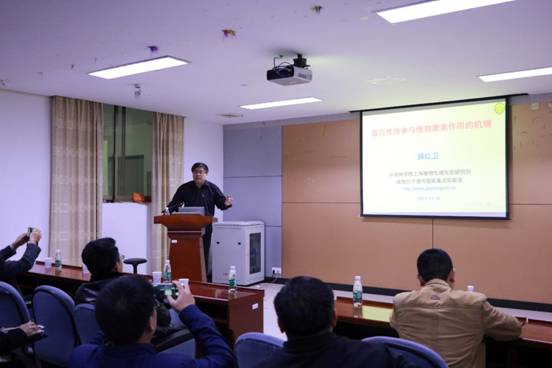 此次学术报告,薛红卫研究员主要围绕酪蛋白激酶(Casein kinase, CK)和蛋白酶体调节因子1 (PROTEASOME REGULATOR1,PTRE1)展开。他以深入浅出的方式向我们讲述了拟南芥CK1在调控乙烯生物合成中的功能及特征。其课题组研究发现,乙烯过度累积能导致CK1.8缺陷突变体黄化幼苗(etiolated seedling)显示特征性的、乙烯特异性组成型反应。进一步研究证实,CK1.8能导致ACS5磷酸化,并导致ACS5的积累,进而促进其稳定性,同时CK1.8也促进了它与E3泛素连接酶ETO1互作。这些研究提供了有关ACS5调控和乙烯生物合成的一些新见解。生长素在植物生长发育过程中发挥重要调节作用。Aux/IAA蛋白作为转录抑制子被泛素化介导的蛋白酶体途径降解,但是对Aux/IAA蛋白快速降解的精细调控机制目前仍不清楚。其团队发现植物蛋白PTRE1在此过程中发挥了重要作用。生长素可能通过改变PTRE1蛋白的亚细胞定位进而抑制蛋白酶体活性并调控Aux/IAA的降解,并与生长素受体TIR1共同精确调控Aux/IAA蛋白的平衡及生长素信号。由于蛋白酶体通过降解蛋白参与了多种激素作用和植物对逆境的响应,该研究不但初步揭示了生长素对蛋白酶体活性的调控,也为进一步解析生长素和植物激素作用机制提供了新线索。随后师生们踊跃提问,薛红卫研究员均一一耐心解答。整个报告会气氛热烈,启发了在座师生的科研思路,激发了大家的科研热情,令师生们受益匪浅。