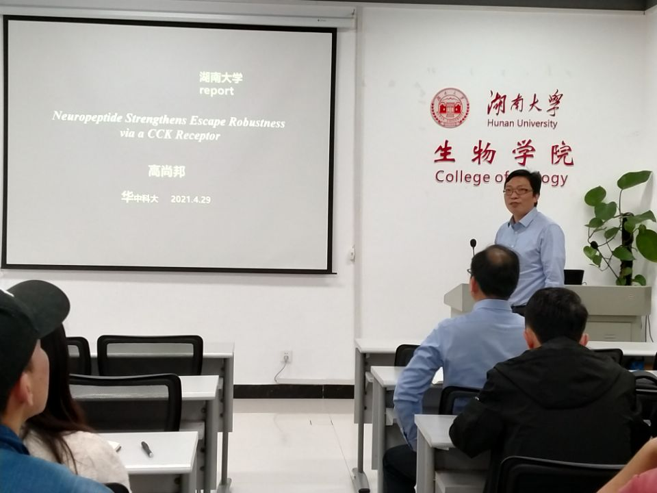 高尚邦教授的报告精彩且深入。高教授以秀丽隐杆线虫为模型,运用分子生物学、电生理、光遗传学和光学成像等技术研究动物运动行为的神经环路与分子机制。首先,高教授以自然界生物“逃避危害”行为为切入点,展开讲座内容。神经肽(Neuropeptide)在体内参与调节包括运动等的多种生理过程。高教授团队通过筛选线虫(C. elegans)不同神经肽缺失的突变体,发现缺失神经肽nlp-18的线虫在逃跑过程中不能完成像野生型线虫一样“后退—Full Ω转向—逃跑”的普适性逃跑过程。通过检测和分析该突变体线虫在逃跑过程中的Ω比例,头部的曲率,身体形成的Ω角度,证实ASI神经元合成分泌的神经肽NLP-18参与线虫逃避行为的调控。借助电生理、钙成像技术及相应的分子生物学实验,鉴定到SMD/AIB神经元上的G蛋白偶联受体胆囊收缩素受体(Cholecystokinin Receptor)CKR-1作为受体接收NLP-18信号,传递信息调节线虫的转向行为。同时,发现CKR1通过Gq蛋白将信号进一步传递,进而调节线虫的逃避行为。高教授的报告内容丰富,实验设计严谨精巧,外加实验过程中的细节故事,为广大师生带来一场精彩的学术讲座,引起了在场师生的热烈、积极的提问和讨论。最后,讲座在一片激烈的掌声中结束。