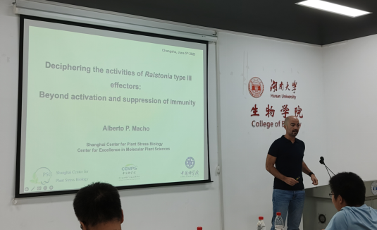 Alberto P.Macho研究员为我们作了题为“Deciphering the activities ofRalstonia solanacearumtypeIIIeffectors: beyond activation and suppression of immunity”的报告,Alberto首先为我们介绍了植物免疫和病原菌致病之间的关系,之后介绍了模式病原菌青枯菌的致病机理,解析了青枯菌通过分泌多种Ⅲ型效应蛋白抑制植物免疫促进自身侵染的机理,如RipI可以调控植物代谢来为自身提供营养,RipAK靶向丙酮酸脱羧酶通路抑制植物抗性,Alberto重点介绍了RipAC的功能,RipAC可能改变细胞壁相关过程,与纤维素合酶相互作用蛋白1(CSI1)相互作用,破坏CSI-CSC复合体的形成,影响侧根的生长,促进青枯菌毒力。