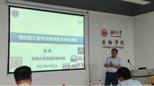 张勇教授为我们介绍了青枯菌Ⅲ型分泌系统的全局性调控。张勇教授首先为我们系统地讲述了青枯菌侵染宿主的过程、青枯菌Ⅲ型分泌系统的动态调控网络,群体感应依赖型全局性调控因子PhcA通过不同的方式可以分别正/负调控青枯菌的诸多侵染行为和Ⅲ型分泌系统相关蛋白的转录表达。此外张勇教授研究团队鉴定到两个蛋白TapV、CysB也能调控Ⅲ型分泌系统的功能。之后,张勇教授介绍了青枯菌Ⅲ型分泌系统的三个转录表达特性:可作为一种信号被宿主识别、在丰富培养基中不表达、调控因子PhcQ-PhcA抑制Ⅲ型分泌系统的表达。