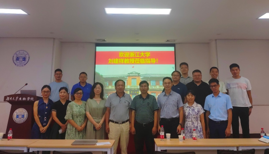 本次报告刘建祥教授以“挽救春姑娘”、“油门和刹车”等故事角度,趣味性给师生们解读了植物热形态建成的机制。首先,刘建祥教授介绍了温和高温下,BBX18招募E3泛素连接酶XBAT31泛素化降解温度传感器ELF3蛋白,解除ELF3对转录因子PIF4的抑制作用,促进植物生长发育的分子机制。然后,介绍了温和高温下RVE5通过竞争缓冲了CCA1对ELF4的抑制作用,从而促进(维持)了ELF4的表达水平,并精细调控温和高温下植物的生长。紧接着,刘建祥教授介绍了两个跨膜转录因子bzip28和bzip60参与水稻响应极端高温胁迫的机制。本次报告非常精彩,既有理论知识又有许多应用实例,生动有趣。问答阶段,刘建祥教授耐心地一一解答了师生的提问,还幽默地讲述了自己求学的经历,以及学术成果背后的励志小故事,现场反响热烈,学术氛围极佳。刘选明教授代表学院赠与刘建祥教授岳麓书院学规刺绣,部分参会老师合影留念。