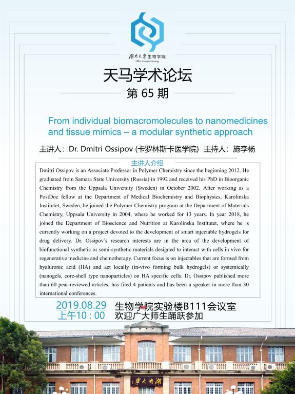 Dmitri Ossipov is an Associate Professor in Polymer Chemistry since the beginning 2012. He graduated from Samara State University (Russia) in 1992 and received his PhD in Bioorganic Chemistry from the Uppsala University (Sweden) in October 2002. After working as a PostDoc fellow at the Department of Medical Biochemistry and Biophysics, Karolinska Institutet, Sweden, he joined the Polymer Chemistry program at the Department of Materials Chemistry, Uppsala University in 2004, where he worked for 13 years. In year 2018, he joined the Department of Bioscience and Nutrition at Karolinska Institutet, where he is currently working on a project devoted to the development of smart injectable hydrogels for drug delivery. Dr. Ossipov’s research interests are in the area of the development of biofunctional synthetic or semi-synthetic materials designed to interact with cells in vivo for regenerative medicine and chemotherapy. Current focus is on injectables that are formed from hyaluronic acid (HA) and act locally (in-vivo forming bulk hydrogels) or systemically (nanogels, core-shell type nanoparticles) on HA specific cells. Dr. Ossipov published more than 60 pear-reviewed articles, has filed 4 patients and has been a speaker in more than 30 international
