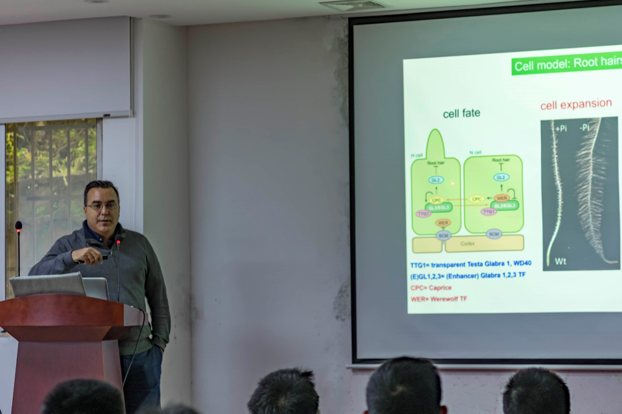 进行学术交流,为学院师生们作了题为“To grow or not to grow,molecular mechanisms of cell sizeregulation inArabidopsis”的学术讲座。Dr. José M. Estevez实验室主要利用根毛作为模型研究细胞的极性生长。本次学术讲座,Dr. José M. Estevez系统介绍了EXTs(Extensins)和RSL4(Root hair defective 6 like 4)等蛋白在根毛极性生长调控方面的研究进展。随后Dr. José M. Estevez与在座的师生进行了交流和互动。