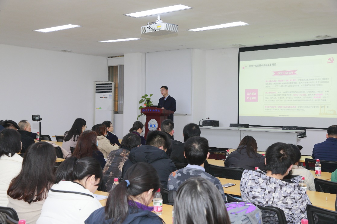 组织召开全院教职工集中政治理论学习,学院党委书记李勇军宣讲党的十九届五中全会精神, 黄色漫画