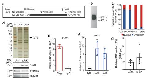 在很长一段时间里,非编码RNA被认为是转录噪声,成为被生物学家忽视掉的生物大分子。近些年,越来越多的非编码RNA展示了其在生命活动中的重要功能。但目前国内外对长非编码RNA参与DNA损伤修复仍然知之甚少,因此我们进行了深入系统探索。通过高通量DNA芯片技术,细胞受到DNA损伤刺激后,我们确认数十个功能未知的长非编RNA转录上调。在后续的研究中,发现一个长非编RNA与NHEJ修复因子复合体Ku70-Ku80(Ku复合体)有相互作用,命名为LRIK(long ncRNA interacting with Ku)。