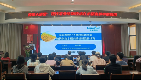 兼职教授身份在会议大厅给学生们授课,作了题为“充分发挥分子育种技术优势,加快杂交水稻突破性新品种培育”的科研讲座。杨老师以自己科研经历为例,介绍了MAS和基因编辑技术在水稻新材料创制和杂交品种培育中的应用,同时对现代生物技术在作物育种中的应用做了展望。授课结束后,杨老师还耐心解答和探讨了同学们提出的问题,并希望同学们能投身现代农业,为国家粮食安全作贡献。