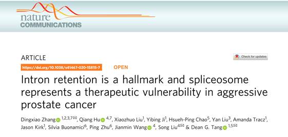 的张定校团队,联合罗斯威尔帕克癌症研究所的唐定国和刘松团队在Nature Communications上发表了题为Intron retention is a hallmark and spliceosome represents a therapeutic vulnerability in aggressive prostate cancer的文章[4]。该研究首次报道了人PCa在其发生发展(包括临床治疗前后)过程中RNA选择性剪接的异常图谱;并揭示剪接体(Spliceosome)小分子抑制剂E7107可以有效地阻碍CRPC的耐药复发和恶性进展;提示靶向癌细胞的剪接体活性是一个新的治疗恶性PCa的临床策略。值得注意的是,E7107的一个减毒衍生物H3B-8800目前已经开始了在血液癌中临床实验(NCT02841540)。