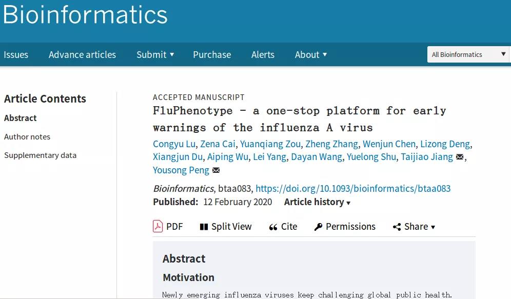 联合苏州系统医学研究所、中国国家流感中心和中山大学等单位,成功开发基于分子标记物的流感病毒表型预测平台FluPhenotype,并在国际生物信息学专业权威期刊《Bioinformatics》发表题为“FluPhenotype-a one-stop platform for early warnings of the influenza A virus"的文章进行相关介绍。该文章的第一作者为 黄色漫画