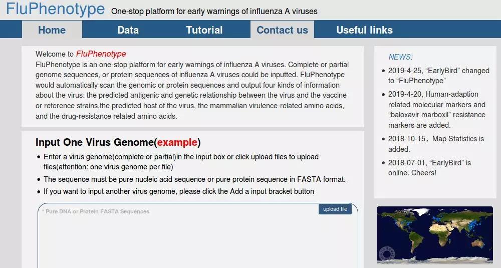 FluPhenotype平台的输入为流感病毒的基因组或者蛋白序列,将自动从基因组或者蛋白序列中抽提分子标记物和序列特征进行病毒表型的预测,输出对于流感病毒的抗原特征、潜在感染宿主、对于哺乳动物的致病性以及对于抗流感病毒药物的耐药性等四个方面的表型,为综合评估该病毒发生和播散的风险提供科学依据,有助于新发突发流感病毒的预测预警。