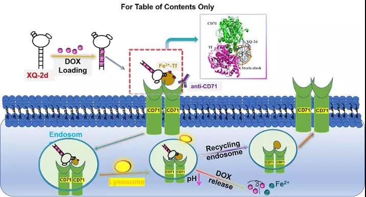 CD71是II型的跨膜糖蛋白,能与含有铁离子的转铁蛋白结合,经网格蛋白内吞途径进入细胞,介导细胞对铁的吸收。研究表明,CD71不仅在胰腺癌中,而且在多种肿瘤中高表达,主要满足肿瘤细胞增殖对铁的需要。基于核酸适体XQ-2d与CD71的特异性结合,该研究进一步通过构建富含GC的XQ-2d嵌合体,装载传统化疗药物DOX,从而实现了化疗药物的靶向递送和胰腺癌的靶向治疗。