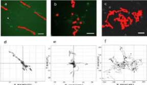 图1骨髓间充质干细胞(MSCs)在有序纤维(a, d)、无序纤维(b, e)以及玻片(c, f)表面的的迁移轨迹对比图。