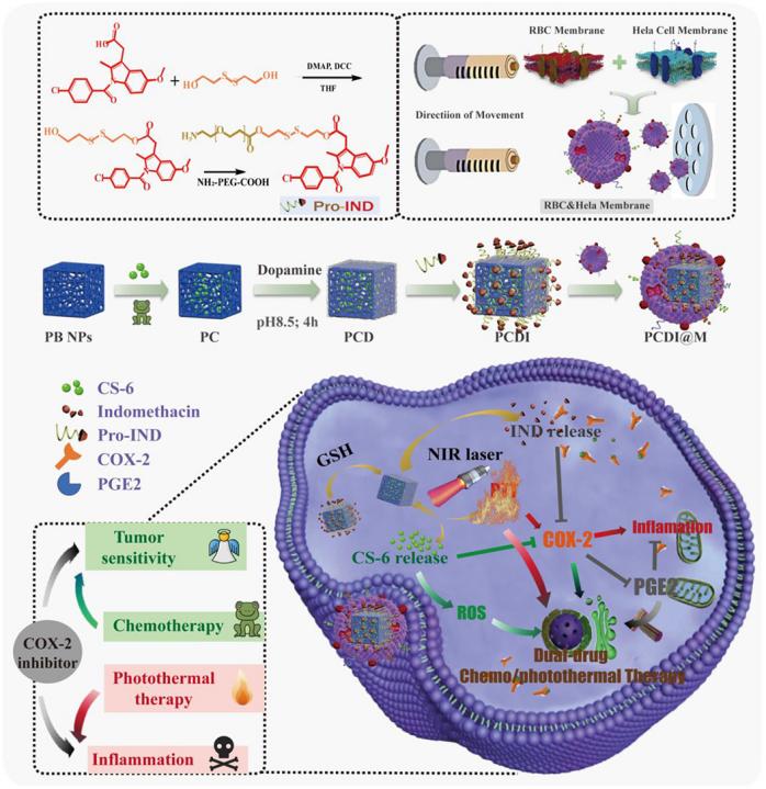 基于课题组前期对光热疗法、蟾蜍来源天然化合物日蟾毒他灵(CS-6)的研究基础上(Biomaterials, 2020, 243:119936; Biomaterials, 2019, 217: 119301; Acta Biomaterialia, 2020, 113: 554-569等),我们提出利用吲哚美辛抑制维持肿瘤炎症微环境的关键酶蛋白COX-2的表达水平,进一步提高日蟾毒他灵(CS-6)与光热疗法联合抗肿瘤疗效的设想,构建了一种基于普鲁士蓝纳米颗粒的抗宫颈癌的前药体系,在荷瘤小鼠模型上取得显著疗效,为发展可用于宫颈癌多模式治疗技术奠定了良好的研究基础。近日,该研究工作在线发表在生物医药领域顶级期刊Journal of Controlled Release(),并已同步申请专利。论文第一作者为 黄色漫画