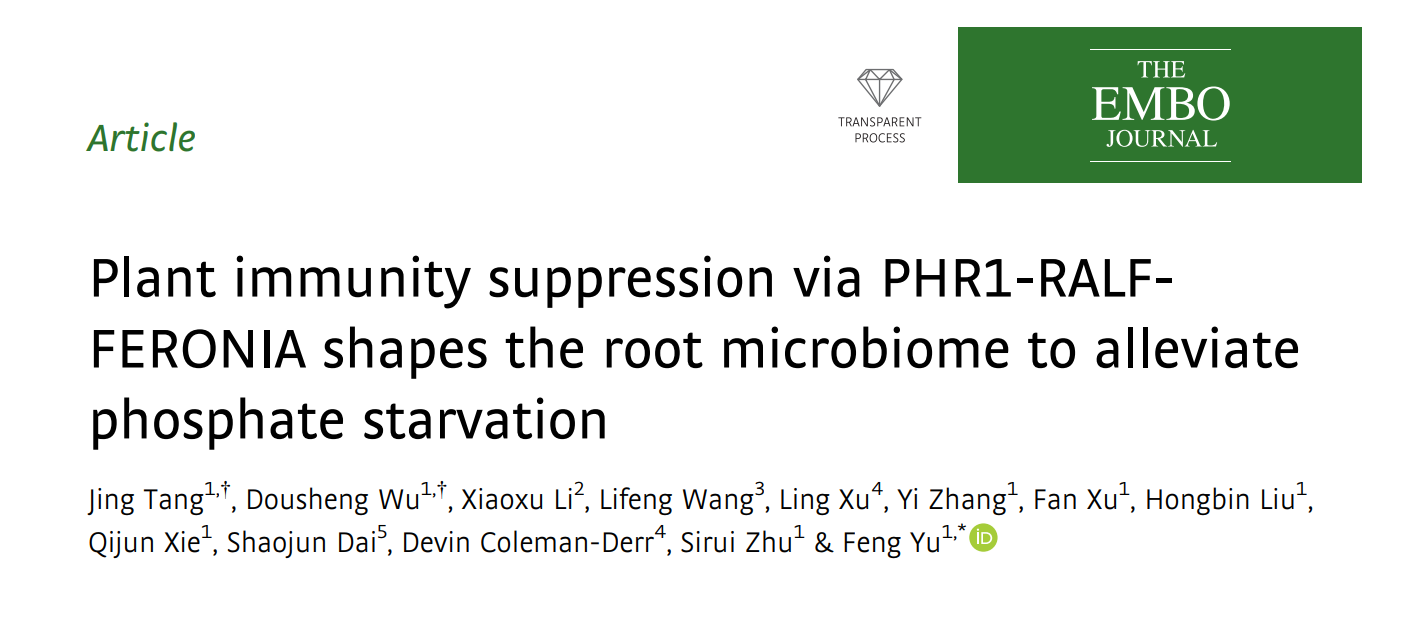 于峰教授课题组在国际著名学术期刊The EMBO Journal(2021 IF:11.596)发表了题为Plant immunity suppression via PHR1-RALF-FERONIA shapes the root microbiome to alleviate phosphate starvation的文章,为提高作物磷吸收效率提供了新的解决思路。