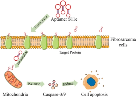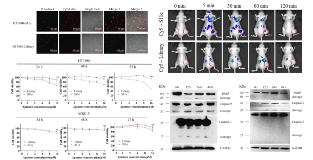 目前,由于缺乏特异性的生物标志物及相关治疗性分子探针,纤维肉瘤准确诊疗无法实现。该研究发现核酸适体S11e能够特异性识别纤维肉瘤细胞HT1080、异种移植小鼠模型肿瘤和纤维肉瘤患者的肿瘤组织。并且S11e能不依赖于溶酶体途径内化定位于线粒体,通过质谱方法鉴定其可能结合靶蛋白Diablo/ SMAC,从而产生抑制癌细胞增殖和迁移等效果。
