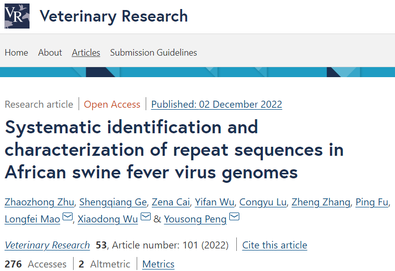 论文4:Zhaozhong Zhu#, Shengqiang Ge#, Zena Cai, Yifan Wu, Congyu Lu, Zheng Zhang, Ping Fu, Longfei Mao*, Xiaodong Wu*,Yousong Peng*. Systematic identification and characterization of repeat sequences in African swine fever virus genomes.Veterinary Research, 2022, 53,101,