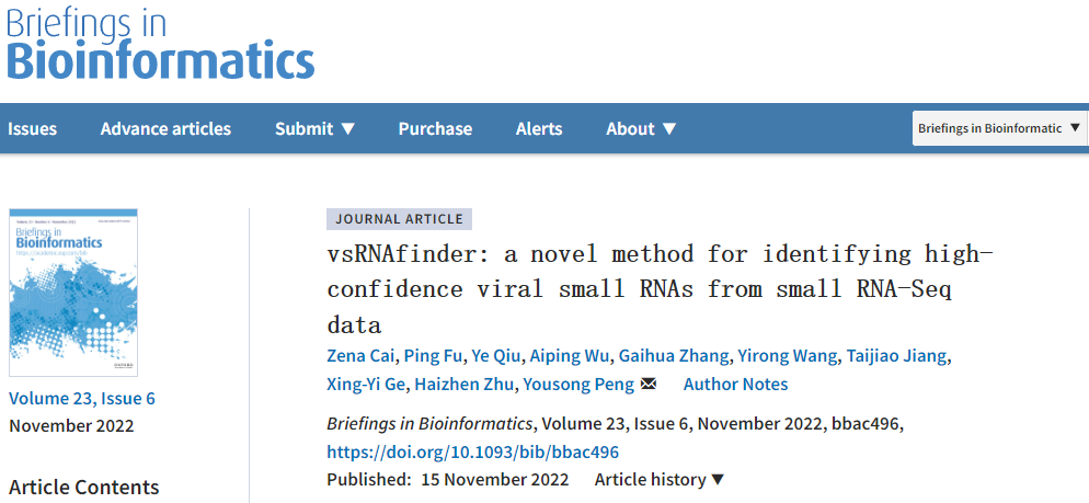 Zena Cai, Ping Fu, Ye Qiu, Aiping Wu, Gaihua Zhang, Yirong Wang, Taijiao Jiang, Xing-Yi Ge, Haizhen Zhu, Yousong Peng, vsRNAfinder: a novel method for identifying high-confidence viral small RNAs from small RNA-Seq data, Briefings in Bioinformatics, bbac496,