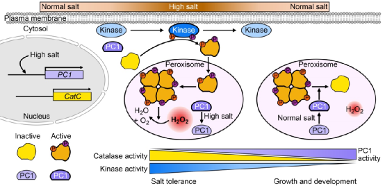 通过种子根和酶活性分析发现,PC1在水稻由耐盐至正常生长发育状态的转变过程中起着重要的调控作用。遭受盐胁迫时,磷酸酶PC1活性被抑制,相关激酶被激活,在质膜的胞质侧磷酸化CatC,并转移至过氧化物酶体形成四聚体,抑制细胞内H2O2的积累,消除氧化损伤,提高水稻耐盐性;解除盐胁迫时,激酶活性被抑制,磷酸酶PC1活性升高,在过氧化物酶体中去磷酸化CatC的Ser-9,促进CatC四聚体的解聚及活性下调,维持细胞内合适H2O2含量(作为信号分子),促进水稻正常生长发育(图2)。该论文中所鉴定的PC1为解析CAT如何去磷酸化而关闭的分子机制提供了可能,并且PC1作为CAT活性响应盐胁迫的分子开关而参与耐盐和正常生长发育平衡的调控,同时也为培育耐盐水稻提供了新的策略。The Plant Cell将该论文选为亮点文章,并专门撰写了题为“Molecular switch to regulate salt-tolerance in rice”的推送文章。有趣的是,研究团队先前解析了一个类受体胞质激酶STRK1磷酸化CatC而正调控水稻耐盐性的分子机制,也作为亮点文章发表(Zhou et al., Plant Cell, 2018)。激酶STRK1和磷酸酶PC1功能的先后解析较为完整地揭示了CAT受可逆磷酸化调控的分子开关作用机制。
