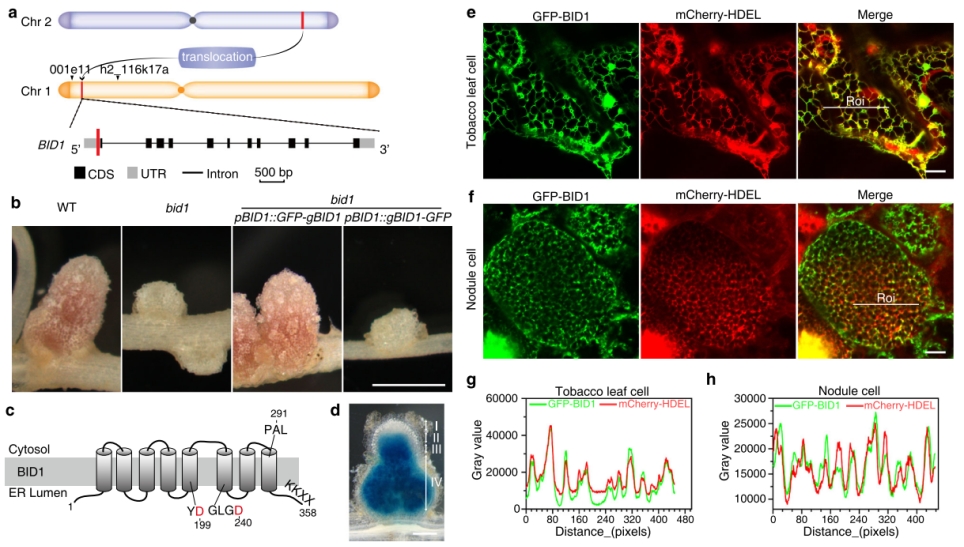 根瘤细胞中,从内质网向共生体运输的调控蛋白,如NCR多肽等,在它们的未成熟序列的N端会有信号肽肽段。之前的研究表明,根瘤特异的DNF1信号肽酶切复合体能够切除信号肽肽段,确保成熟蛋白的正确折叠和转运。通过遗传筛选,潘怀荣课题组发现了一个蒺藜苜蓿固氮缺失型突变体bid1。bid1突变体只能形成白色圆形的小根瘤,根瘤细胞中的共生体不能够正常分化,呈现出和自由生长类似的状态。图位克隆和全基因测序发现,bid1突变体中1号染色体上臂存在突变,2号染色体上1个8857 bp的片段易位到MtrunA17_Chr1g0147151基因的5’ UTR的位置。遗传互补表明,正是这个易位突变导致了bid1突变体的表型。