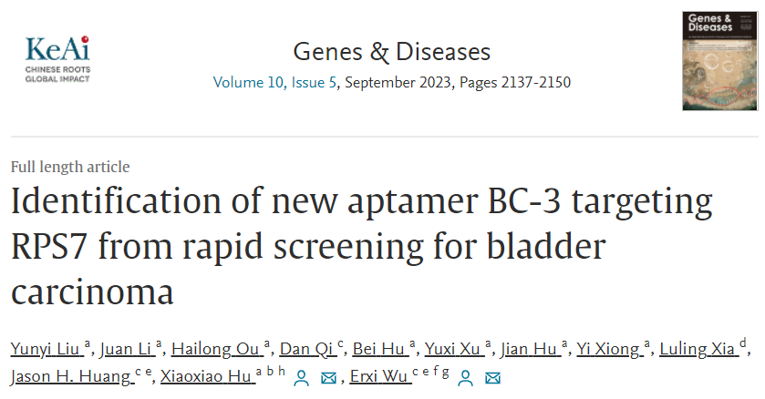 胡小晓课题组也通过X-aptamer技术进行细胞筛选获得一条膀胱癌特异性的核酸适体BC-3,初步考察其性质并鉴定其靶标为RPS7。核糖体蛋白的异常表达可诱发肿瘤等疾病的发生,因此通过分子探针识别或靶向RPS7可以针对膀胱癌提供一种新的诊断和治疗途径。相关研究论文“Identification of new aptamer BC-3 targeting RPS7 from rapid screening for bladder carcinoma”在《Genes & Diseases》期刊(生物化学与分子生物学,Q1)上发表, 黄色漫画