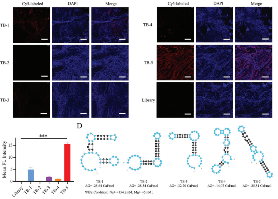 在该研究中,胡小晓课题组通过X-aptamer技术进行组织筛选得到一条对膀胱癌诊断和治疗的新型非G-四链体结构的DNA适体TB-5。作者初步发现TB-5的靶标分子蛋白为核仁素(Nucleolin,NCL),并证明其是膀胱癌的一种潜在生物标志物。NCL被认为是癌症领域的一个重要的治疗性靶点。因此作者还考察了TB-5在人膀胱移行性细胞癌253J-BV内的生物学功能,发现了TB-5具有肿瘤特异性杀伤的能力,并且主要通过结合NCL介导细胞内转录失调,诱导细胞出现自噬,以及抑制迁移和侵袭作用。