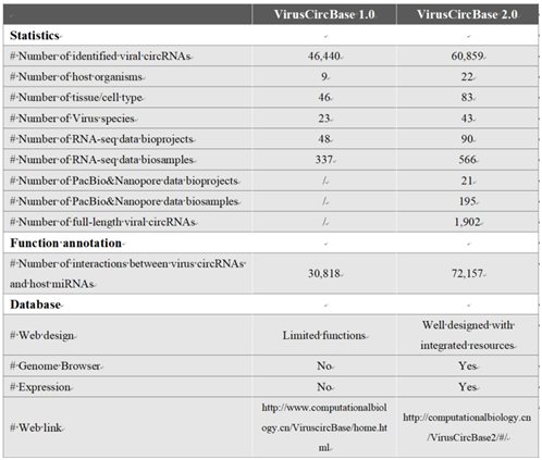 表1. VirusCircBase 1.0和VirusCircBase 2.0的比较