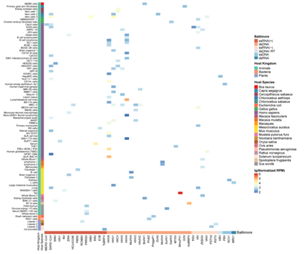 图2.病毒circRNA在不同宿主的不同组织或细胞中的表达
