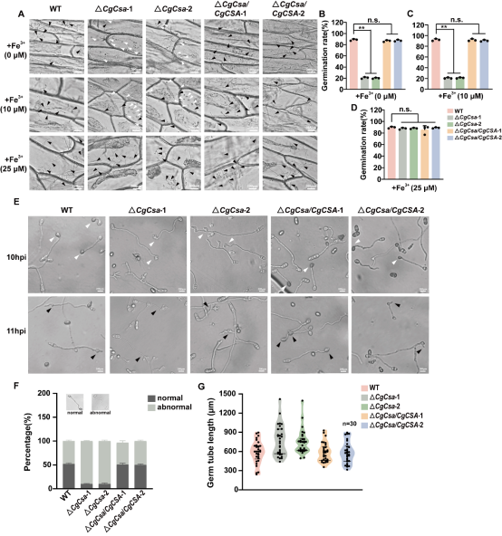 通过基因敲除、回补以及生物学表型分析,发现CgCsa的缺失导致C. gloeosporioides菌丝分生孢子产量降低、细胞壁和细胞膜完整性受到破坏、极性生长受阻、分生孢子萌发延迟和附着胞异常且芽管变长,这些共同导致了CgCsa缺失突变体(ΔCgCsa)致病性下降,而CgCsa 回补体(ΔCgCsa/CgCSA)的生物学表型均与野生型(WT)一致。此外,研究发现与WT和ΔCgCsa/CgCSA相比,ΔCgCsa铁转运相关基因的表达量下调,且在培养基中添加Fe3+可部分恢复ΔCgCsa的生物学功能。进一步通过分子对接,普鲁士蓝染色以及利用电感耦合等离子体发射光谱仪测定菌丝体内铁含量,证明CgCsa蛋白能够与Fe3+结合。综上所述,CgCsa是调控真菌生长发育和致病性的重要蛋白质。其中一个重要机制是 CgCsa具有结合铁的能力,并能维持C. gloeosporioides的铁稳态。这项研究为控制植物真菌病害提供了新的见解,即可通过耗竭真菌所需的微量元素来控制真菌病害,同时为开发CgCsa蛋白作为控制真菌病害的新靶标提供理论依据。
